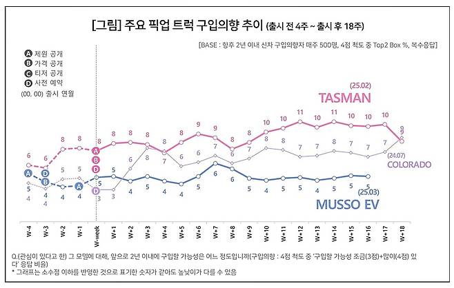 올해 2월 출시된 타스만은 4개월이 지났음에도 큰 하락 없이 10%선을 유지하고 있다. 지난주 9%로 떨어지기는 했지만 출시 후 3~4주면 구입의향이 하락하는 일반적 패턴을 고려하면 눈에 띄는 선전을 펼치고 있다는 분석이다.