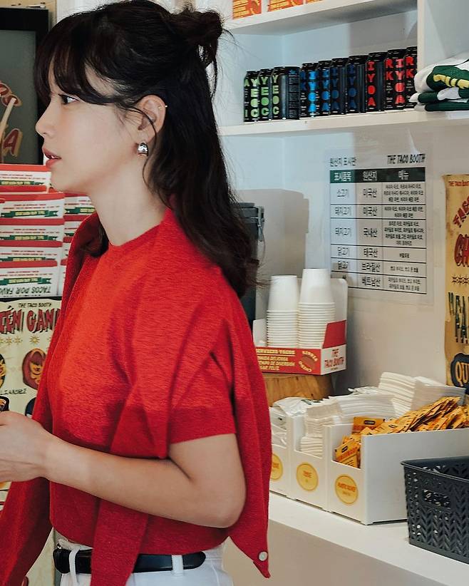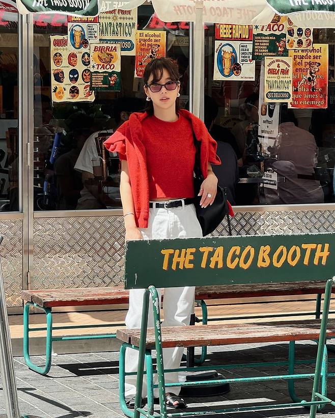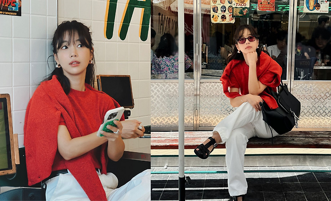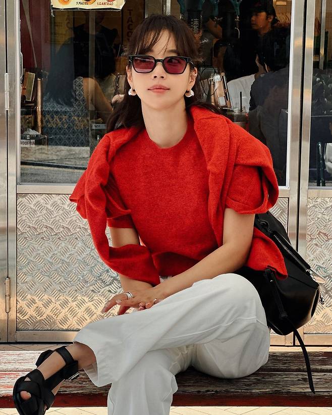 사진 속 기은세는 빨간 니트 반팔티와 가디건을 두르고 화이트 팬츠와 블랙 샌들을 신어 레드룩을 선보였다.