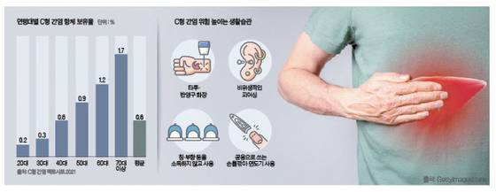 C형 간염은 40대 이후부터 감염 위험이 커진다. 중앙대병원 소화기내과 김형준(대한간학회 총무 이사) 교수는 “나이가 많을수록 혈액 접촉에 따른 잠재적 감염 기회가 많아 C형 간염 바이러스에 감염될 수 있다”고 말했다. 국내 C형 간염의 80% 이상은 45세 이상이라는 보고도 있다. 대한간학회에서 발표한 2021 C형 간염 팩트시트에 따르면 국내 C형 간염 항체 보유율은 0.6% 수준이다. 특히 20대 C형 간염 바이러스 항체 양성률은 0.2% 정도지만, 50대 0.9%, 60대 1.2%, 70대 1.7%로 나이가 들수록 높아지는 경향을 보였다.