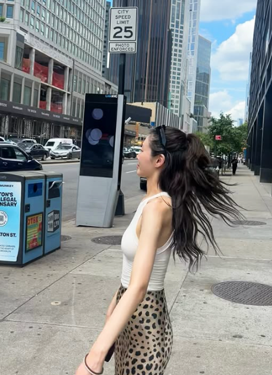 스커트는 리얼리제이션 파의 'THE NAOMI in Wild Things' 제품으로, 레오파드 패턴과 실크 소재가 조화를 이뤄 시선을 끌었다.