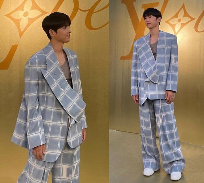 이날 송중기는 타이다이 체크 패턴의 멋스러운 슈트룩으로 등장, 시선을 사로잡았다.