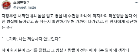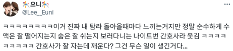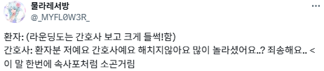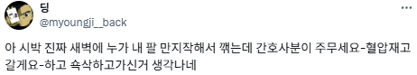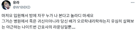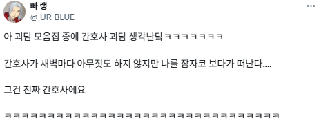 아 괴담 모음집 중에 간호사 괴담 생각난닼ㅋㅋㅋㅋㅋㅋㅋ간호사가 새벽마다 아무짓도 하지 않지만 나를 잠자코 보다가 떠난다....그건 진짜 간호사에요ㅋㅋㅋㅋㅋㅋㅋㅋㅋㅋㅋㅋㅋㅋㅋㅋㅋㅋㅋㅋㅋㅋㅋㅋㅋㅋㅋㅋㅋㅋㅋㅋ— 빠 랭 (@_UR_BLUE) January 12, 2021