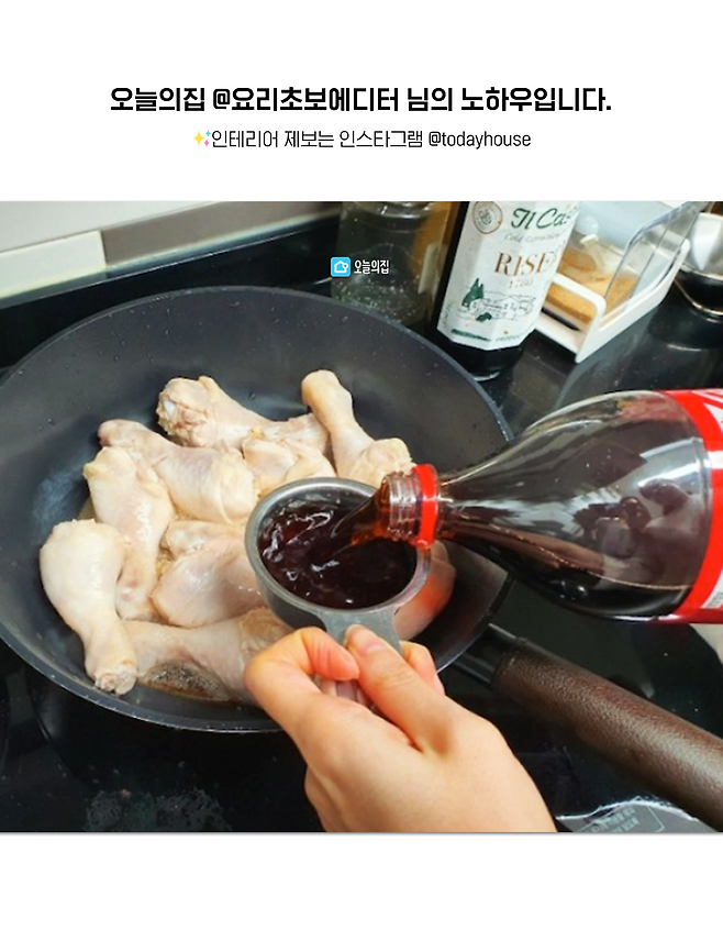 넓은 웍에 옮겨 담은 닭고기에 콜라 500ml를 넣어주세요!