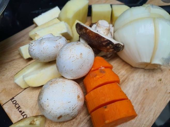 참고로 찜닭에 감자와 고구마는 되도록 넣는 것이 좋아요. 식감을 배로 살려주거든요. 양파도 좀 더 단 맛을 위해 넣어주었어요~