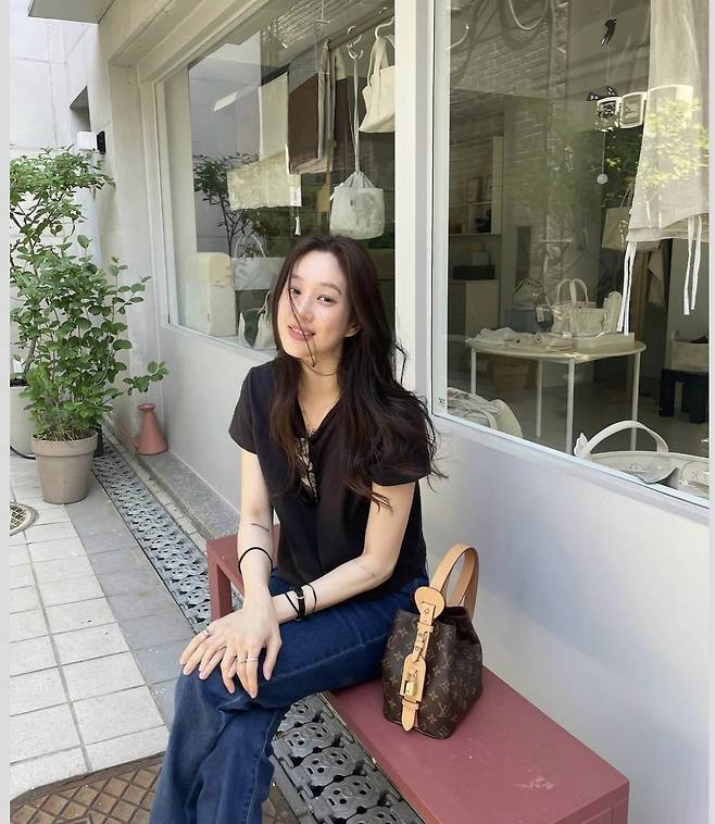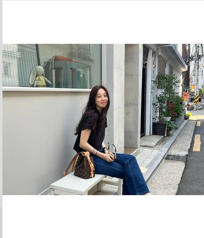 정려원은 블랙 티셔츠와 진청 데님이라는 기본 조합에 루이비통(Louis Vuitton) 핸드백을 더해 럭셔리한 포인트를 주었으며 블랙 슬리퍼와 심플한 액세서리를 더해 특유의 도시적인 시크함을 강조했습니다.