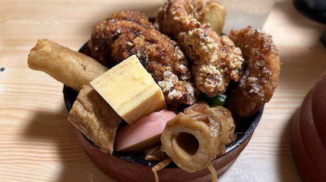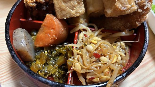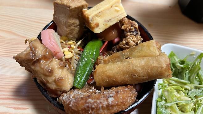 고로케, 춘권, 계란말이, 두부조림, 치쿠와조림, 분홍색어묵 등이 보입니다.