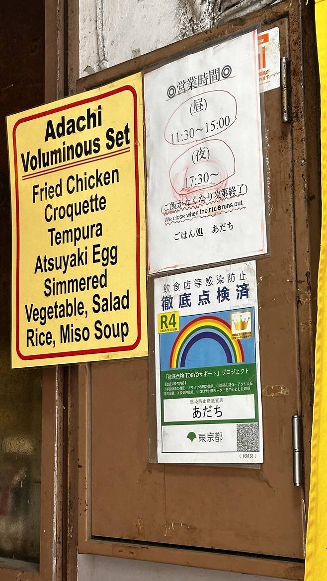 아다치 세트의 구성이 영어로 적혀 있고, 영업시간도 있네요.