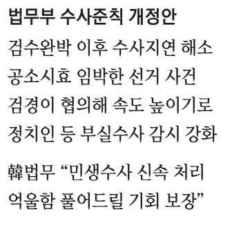 한동훈 법무부 장관은 개정안 도입과 관련해 "수사준칙은 민생준칙"이라며 "서민 생활과 직결된 대다수 민생 사건 수사가 지금보다 조금이라도 더 빨라지는지, 국민의 억울함을 풀어드릴 기회를 한 번이라도 더 보장해드릴 수 있는지를 가장 먼저 고려했다"고 밝혔다.