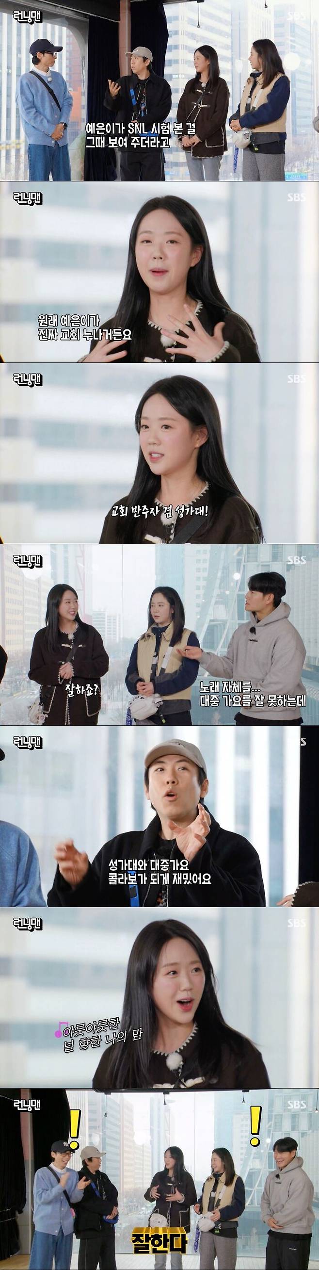 이에 김종국은 "예은이가 노래 자체를 대중가요는 잘 못하는데 성가대 노래는 잘하더라"라고 했고 양세찬도 "성가대와 대중가요의 콜라보가 재밌다"라고 평가했다.