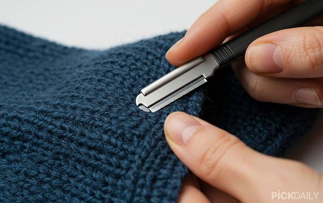 일회용 면도기를 니트 표면에 살짝 대고, 위에서 아래로 결 방향대로 쓸어내리면 보풀이 잘립니다. 너무 세게 누르면 니트 실까지 잘릴 수 있으니 힘 조절이 중요합니다. 면도 후에는 테이프나 롤클리너로 잘린 보풀을 깨끗하게 제거해 마무리합니다.