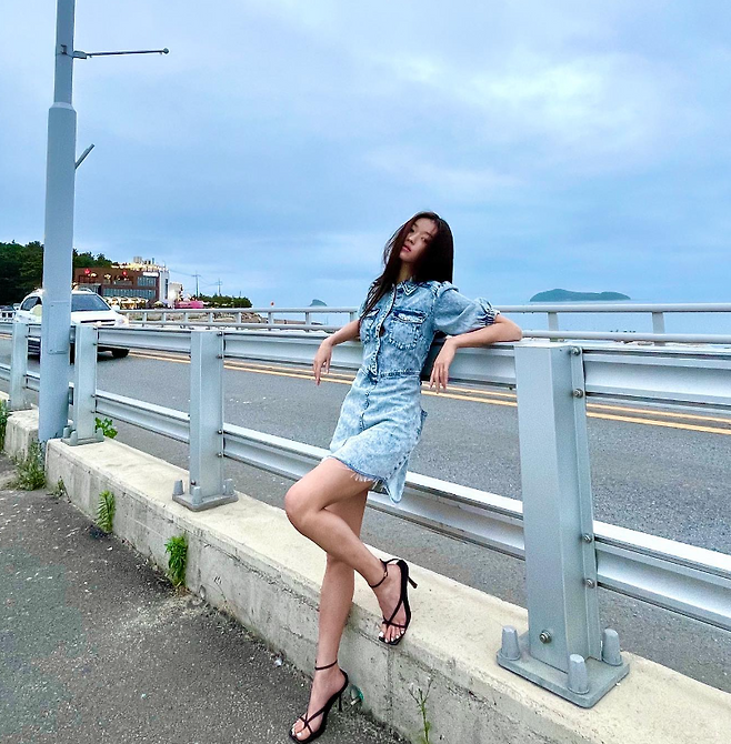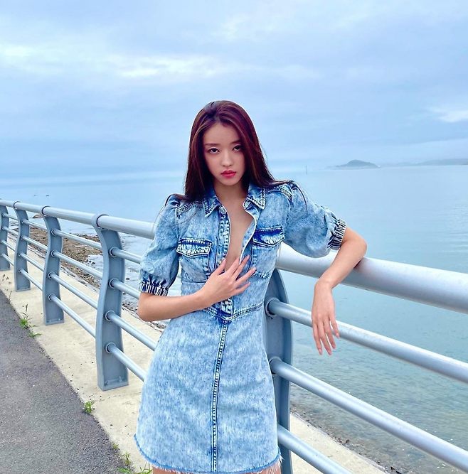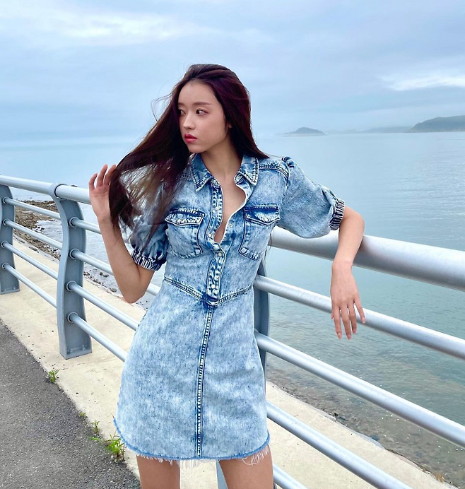 유아는 벌룬 소매 데님 원피스를 입고 고혹적이면서 상큼발랄한 느낌을 자아냈어요.