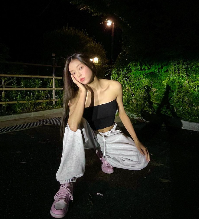 유아는 튜브톱에 트레이닝 팬츠를 매치한 애슬레저룩도 선보였는데요.