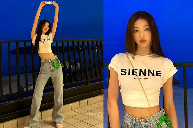 유아는 크롭티에 청바지를 매치한 여행룩을 선보여 눈길을 끌었는데요.