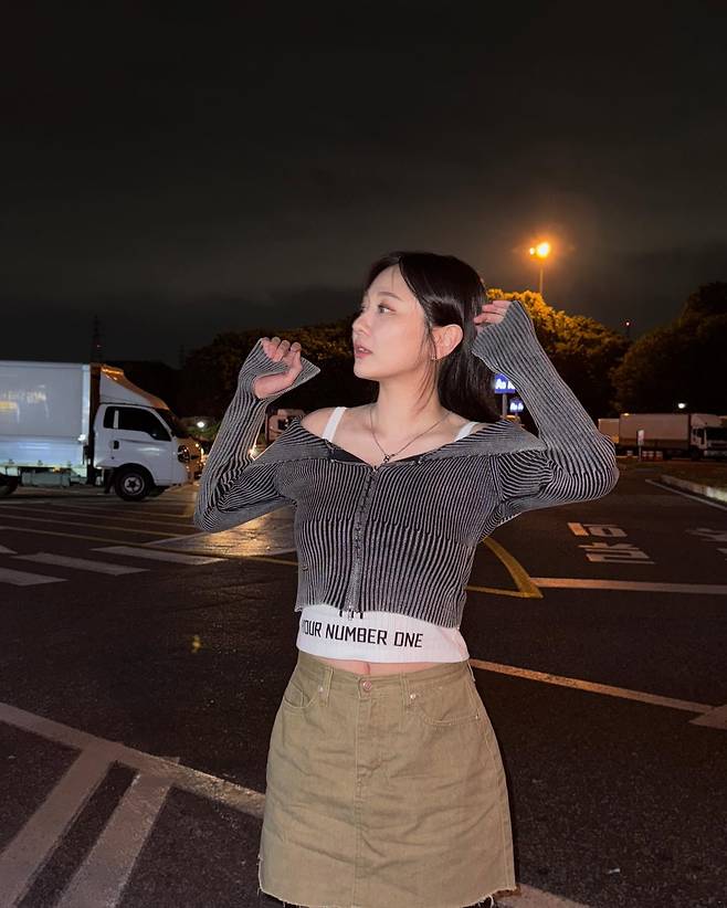 안지영의 이번 룩은 소녀 감성과 Y2K 스트릿 무드를 완벽하게 섞은 매력적인 스타일이에요.