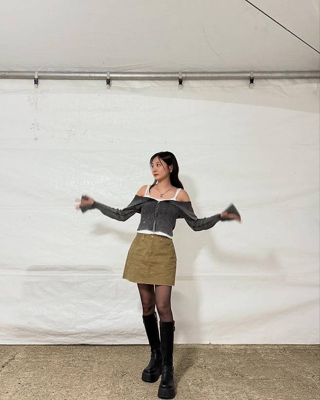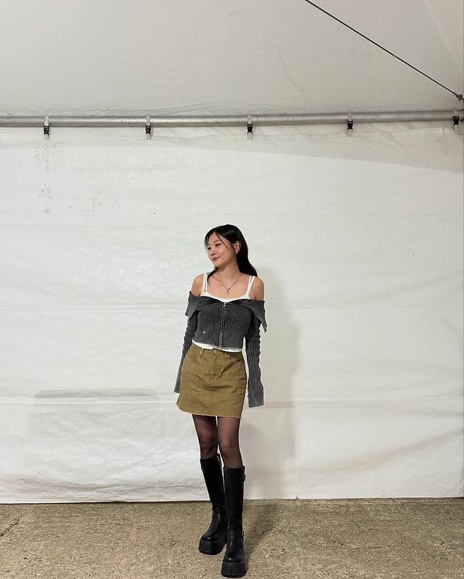 하의는 카키빛의 코듀로이 미니스커트를 매치해 차분하면서도 경쾌한 무드를 줬고, 여기에 허벅지까지 올라오는 블랙 롱부츠로 비율을 확 살렸어요.