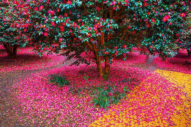 카멜리아 힐은 넓은 정원에 다양한 동백나무 품종이 심겨 있어 꽃의 색감과 크기가 다채롭습니다.
