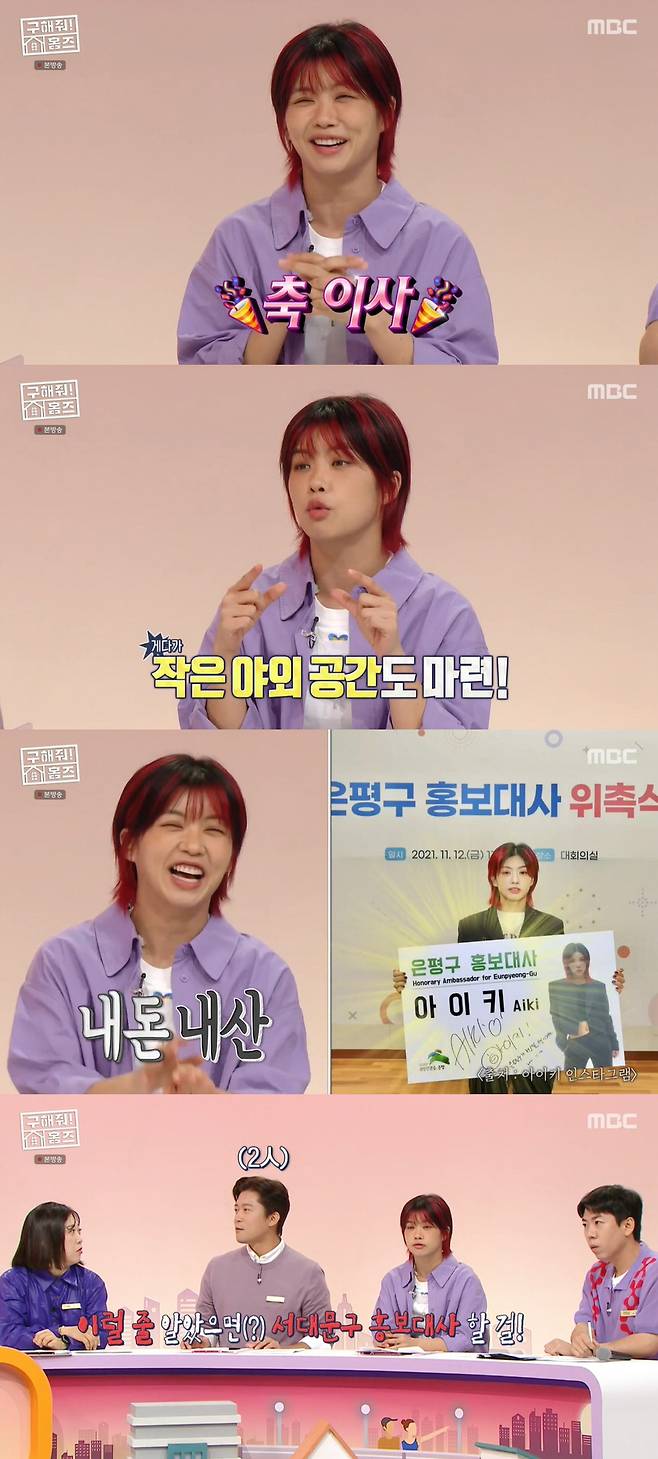 장동민은 은평구 홍보대사인 아이키에게 "은평구에서 준 거냐"며 농담했고, 박나래는 "은평구는 홍보대사 하면 집을 주냐"며 거들어 웃음을 자아냈다. 그러자 김대호는 "이럴 줄 알았으면 나도 서대문구 홍보대사 할 걸 그랬다"며 아쉬워했다.