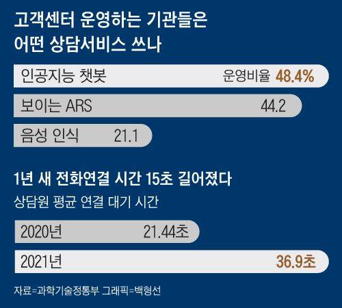 특히 실제 상담원과 통화해야 안심되는 금융 거래의 경우 전화 상담 연결이 어렵다는 불만이 점점 커지고 있다. 과학기술정보통신부가 2021년 전화 상담을 운영하는 기관 200여 곳 만족도를 조사했더니 ‘상담원 연결 시간’ 항목에서 금융 투자·결제 서비스(73.5점)와 은행(80점)은 평균(80.7점)보다 만족도가 더 떨어졌다. 상담원 연결 대기 시간은 평균 36.9초로 전년(21.44초)에 비해 1년 새 15.46초 길어졌다.