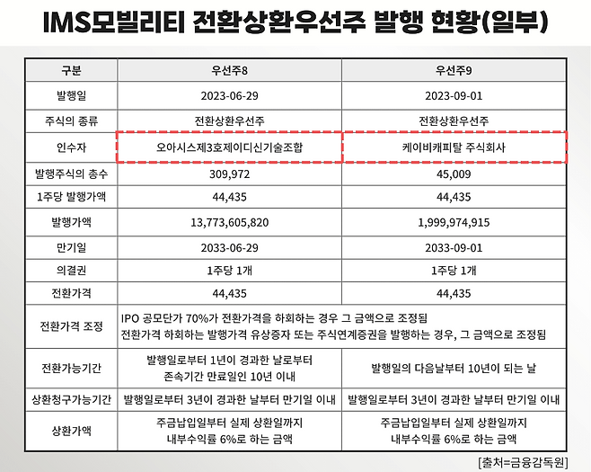 KB캐피탈이 매입한 주식의 가격은 오아시스펀드가 매입한 주식과 동일하게 책정됐으며 상환·전환 조건 또한 거의 동일했다. KB캐피탈과 오아시스펀드가 매입한 상환전환우선주의 상환청구가능기간은 전부 ‘발행일로부터 3년이 경과한 날부터 만기일 이내’였으며 상환가액 역시 ‘주금납입일부터 실제 상환일까지 내부수익률 6%로 하는 금액’ 등으로 똑같았다. KB캐피탈 역시 펀드 투자에 동참하려했던 의도였으나 어떤 사정에 의해 늦춰진 것으로 분석되는 대목이다. 실제 IMS측은 “당초 펀드에 함께 참여하려고 했는데 내부 의사 결정이 늦어져 따로 투자하게 된 것이다”는 입장을 밝힌 것으로 알려졌다.