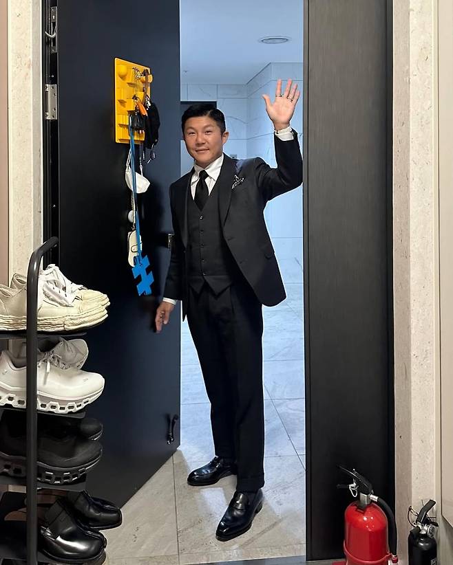 첫 번째 사진에서 조세호는 블랙 슈트에 타이까지 곧게 맨 포멀룩으로 클래식한 매력을 뽐낸다. 테일러링이 돋보이는 3피스 슈트에 포켓치프와 광택 있는 로퍼까지 더해져, 결혼식 하객룩 혹은 공식 스케줄을 연상케 하는 완벽한 포멀웨어 스타일이다. 깔끔하게 빗어 넘긴 헤어스타일까지 더해지며 신뢰감 있는 인상을 배가시킨다.