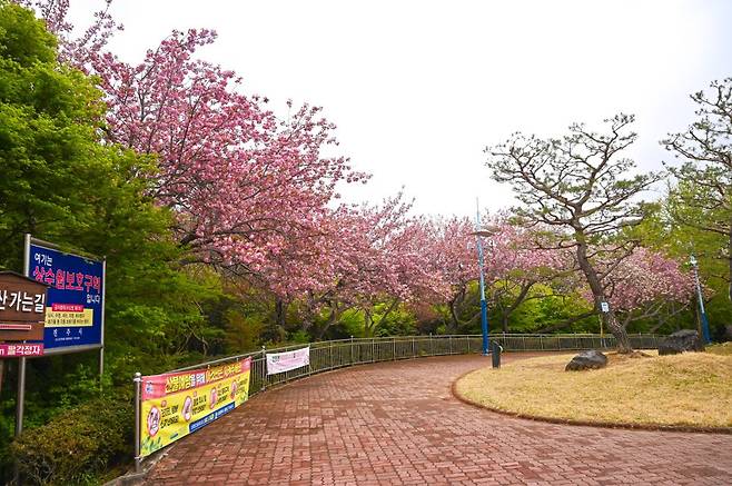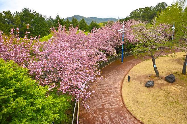 전망대로 올라가는 길 양옆으로는 길게 뻗은 겹벚꽃 나무들이 줄지어 서 있습니다. 단아하고 순결한 꽃말처럼 겹겹이 쌓인 꽃잎들이 나뭇가지마다 몽글몽글 매달려 있는 모습은 마치 무수히 많은 솜사탕이 걸려 있는 듯한데요. 바람이 불 때마다 영화의 한 장면처럼 흩날리는 꽃잎을 손으로 잡으면 소원이 이루어진다는 이야기가 전해져, 많은 이들이 꽃비 아래서 손을 내밀며 행복한 순간을 기록하곤 합니다.