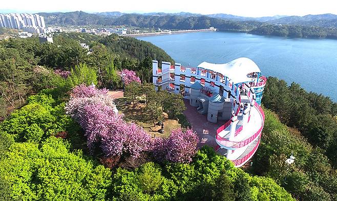 전망대 정상에 오르면 한없이 넓고 잔잔한 진양호의 전경이 파노라마처럼 펼쳐집니다. 날씨가 맑은 날에는 저 멀리 지리산 천왕봉을 비롯해 와룡산, 자굴산, 금오산 등 영남의 명산들이 호수를 병풍처럼 두른 장관을 감상할 수 있는데요. 특히 해 질 녘 전망대에서 바라보는 진양호의 노을은 '진주 팔경' 중 하나로 손꼽힐 만큼 아름다워, 낮의 꽃구경과는 또 다른 감동을 선사합니다.