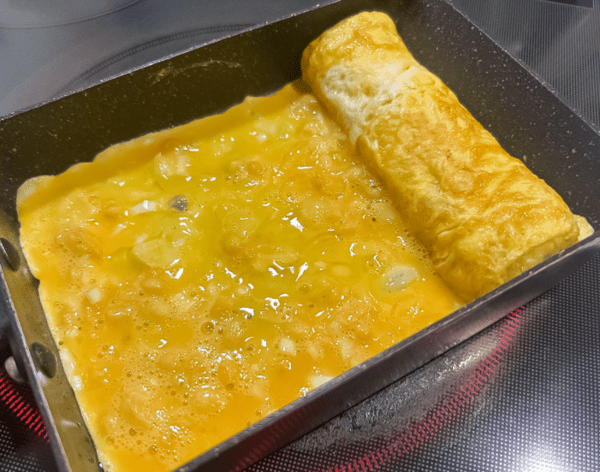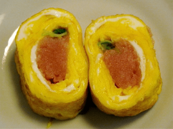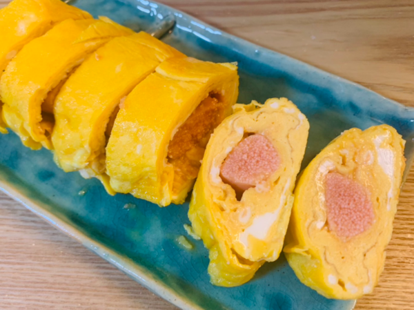 이때 명란을 넓게 퍼뜨리면 말았을 때 모양이 지저분해진다. 한 줄로 모아두는 것이 중요하다. 명란은 따로 익히지 않아도 계란의 열로 충분히 익는다. 수분이 빠지지 않도록 빠르게 말아주는 것이 좋다. 명란의 톡톡 터지는 식감을 살리려면 과도한 가열을 피해야 한다.