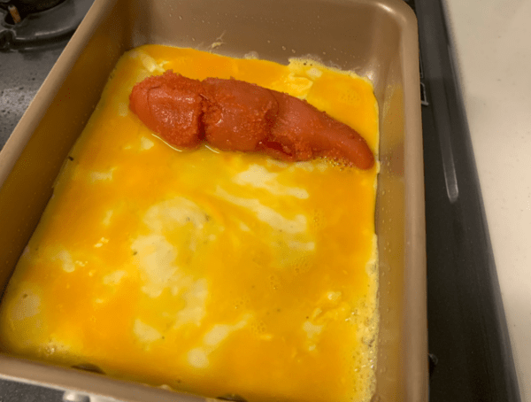 이 층이 명란의 짭짤함을 고르게 퍼뜨린다. 불은 계속 중약불을 유지한다. 센 불에서는 표면이 빠르게 익어 갈라지고 속은 마르기 쉽다. 천천히 익히는 과정이 촉촉함을 유지하는 핵심이다.