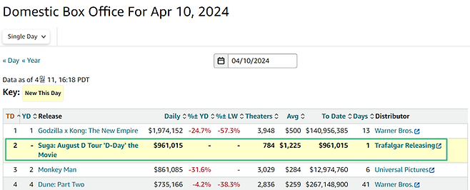 박스오피스 모조의 집계에 따르면 '슈가│어거스트 디 투어 '디-데이' 더 무비'는 미국 전역의 784개 영화관에서 상영됐고, 96만1015달러(한화 13억원)의 수익을 올렸다.