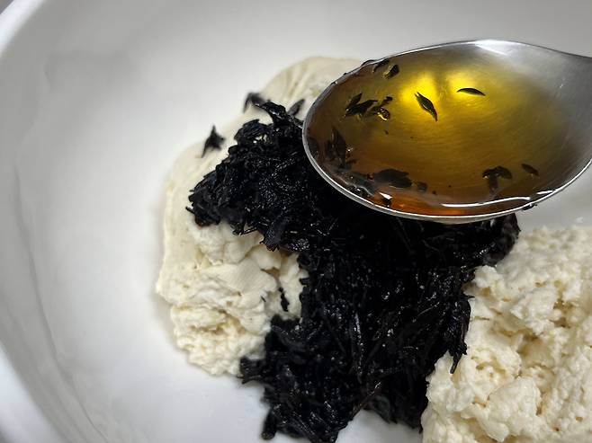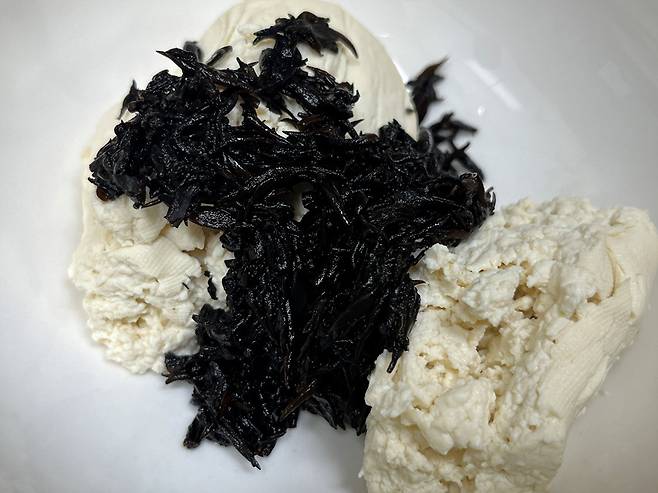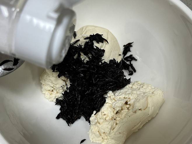 물기 쫙 뺀 두부와 톳을 한 곳에 담아 주세요. 한 번 데친 두부와 톳을 양념한 후 으깨서 비비기만 하면 끝나는 요리입니다.