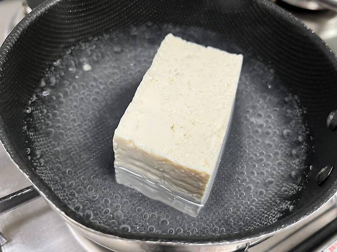 두부 반 모는 끓는 물에 1~2분 데쳐서 잡내를 없애고 단단하게 만들어 주세요. 데친 두부는 체에 밭쳐 물기를 제거합니다.