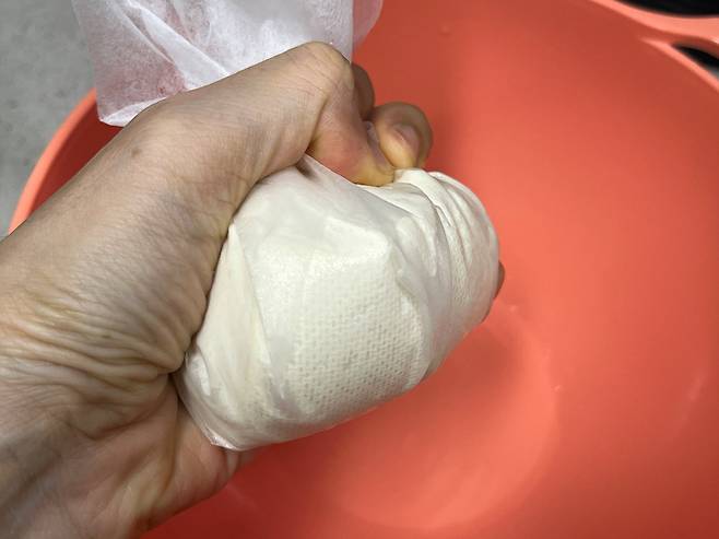 식힌 두부는 면포에 싸서 물기를 제거합니다. 물기를 제거해야 반찬으로 만들어도 물이 금방 생기지 않고, 간이 잘 뱁니다.
