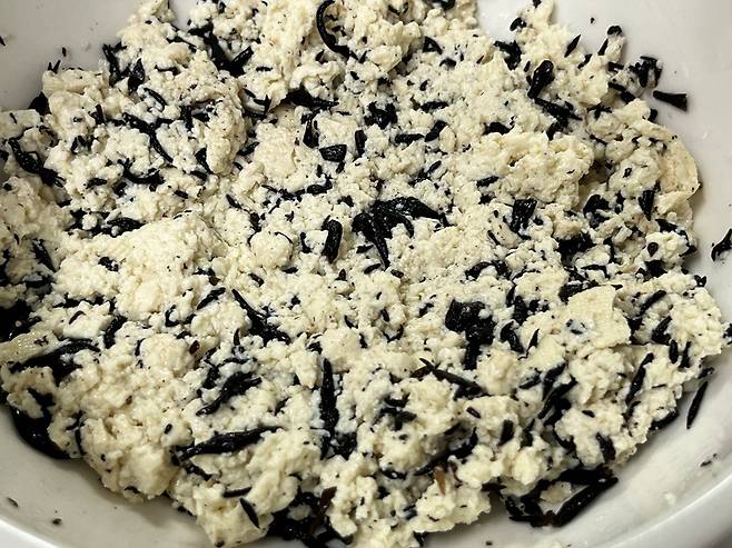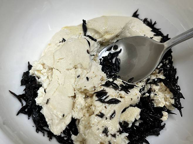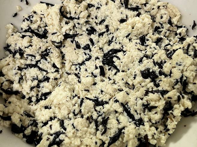 이제 두부와 톳, 그리고 양념이 잘 어우러지도록 으깨서 골고루 섞으세요. 특히 두부는 덩어리가 최대한 없도록 곱게 으깨서 톳과 섞습니다.