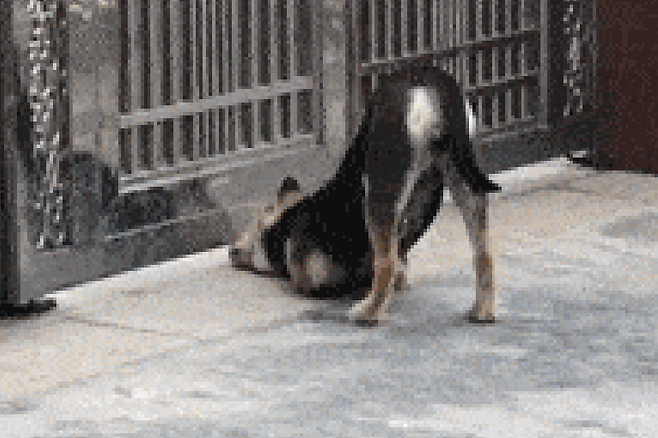 반려견이 너무 신나게 논 탓일까요? 그만 문 밖에 갇히고 말았습니다.