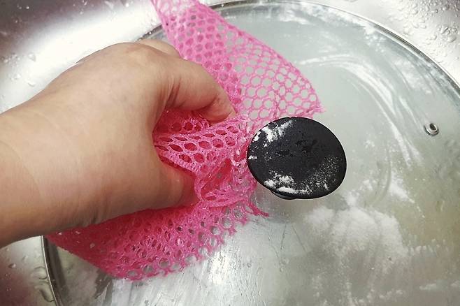 방법은 너무 간단해요. 프라이팬 뚜껑에 베이킹소다를 골고루 뿌리고 수세미로 닦아주시는데요. 이때 주의사항은 수세미를 물을 약간 묻혀 닦아주세요. 물을 약간 묻혀 닦아야 흠집 날 염려를 줄여줍니다.