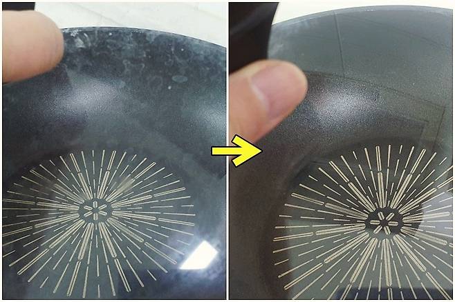 프라이팬 유리 뚜껑을 사용하다 보면 위 사진처럼 희끗한 얼룩 및 찌든 때가 생기는데요. 주방세제로 닦으면 순간은 깨끗해 보여도 다시 원래대로 돌아오더라고요.