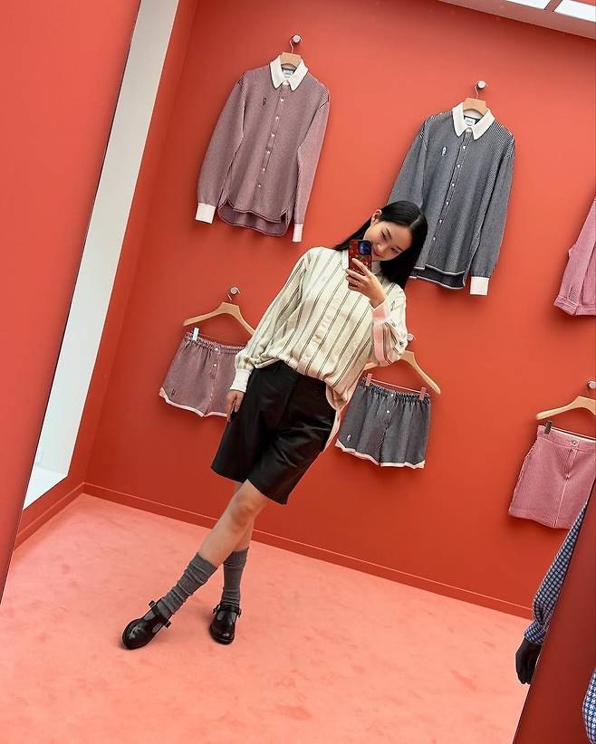 하의 실종룩은 꾸준히 사랑받고 있는 트렌드 중 하나로, 셔츠 원피스나 오버사이즈 톱을 활용한 스타일링이 대표적이다. 신현지는 여기에 패턴 슈즈와 니삭스로 개성을 더해 더욱 특별한 룩을 완성했다. 과감한 듯하면서도 세련된 조합은 그녀만의 스타일을 더욱 돋보이게 만든다.