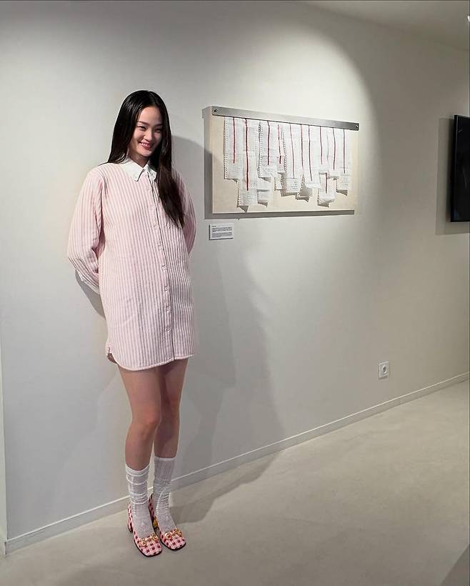 공개된 사진 속 신현지는 화이트 칼라가 포인트인 핑크 스트라이프 셔츠 원피스를 입고 갤러리 한편에 서서 미소를 짓고 있다. 셔츠 원피스의 여유로운 핏은 편안하면서도 세련된 분위기를 자아내며, 짧은 길이감이 그녀만의 감각적인 하의 실종룩을 완성했다.
