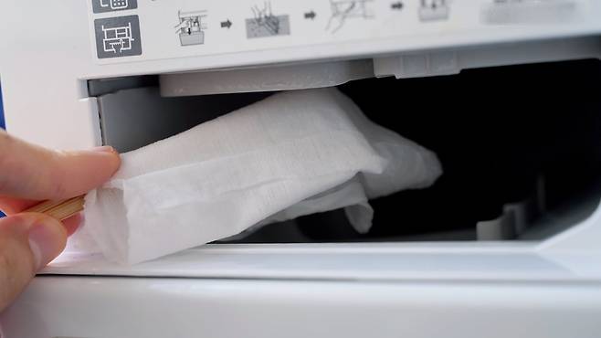 그동안 투입구 안쪽을 물티슈 등을 이용해 닦아 주세요. 손이 닿지 않는 부분은 젓가락 등을 이용해 닦으면 보다 쉽게 닦을 수 있어요.