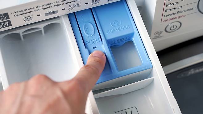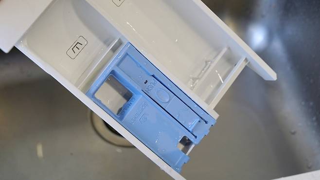 그리고 섬유 유연제가 들어가는 부분인 파란색 부분도 연결된 부분을 풀어서 제거해 주세요.