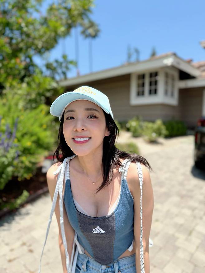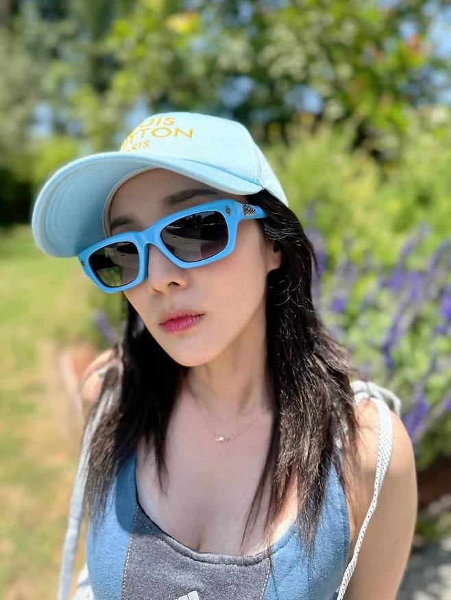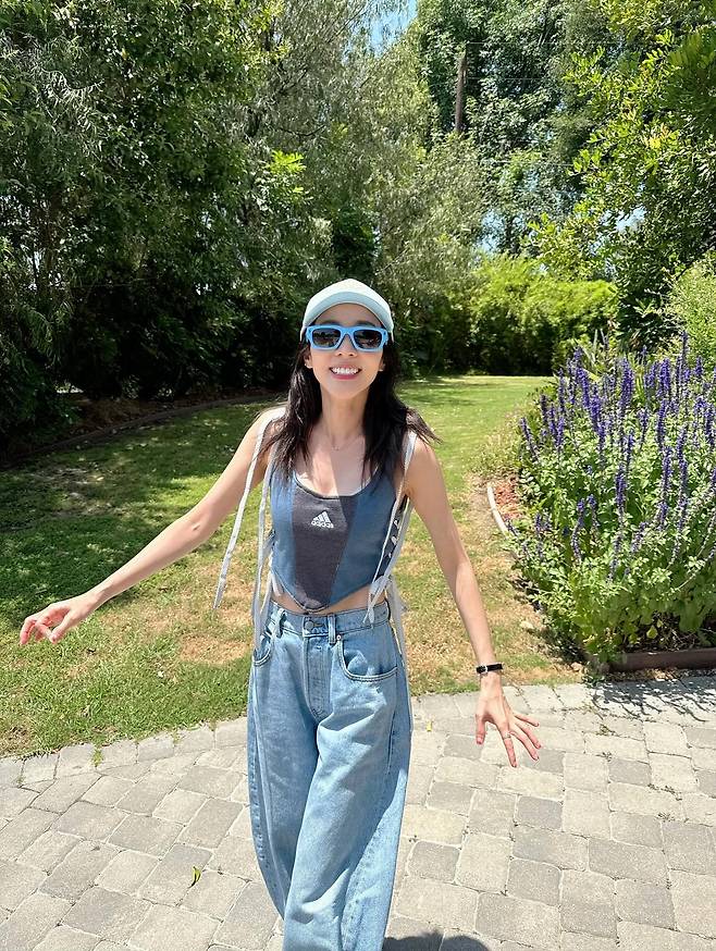 햇살 좋은 정원, 푸르른 잔디 위에서 산다라박은 청량한 데님 톤으로 완벽한 여름룩을 보여줬어요.