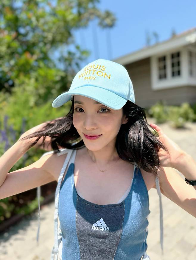 하늘색 캡과 선글라스로 마무리한 무드는 전체적인 색조합을 톤온톤으로 맞춰 한층 더 시원해 보이죠.