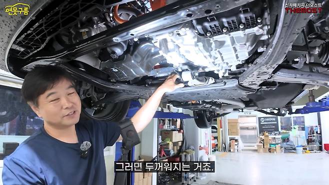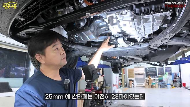 쏘렌토 MQ4 하이브리드 모델의 하부를 계속해서 면밀히 살펴보겠습니다. 이 차량의 하이브리드 시스템을 보면 변속기 주변 공간이 상당히 넉넉하다는 점을 알 수 있습니다. 제 손이 쑥쑥 들어갈 정도로 여유로운 공간이 확보되어 있습니다. 이는 변속기의 기술적인 진화를 보여주는 대목이기도 합니다. 요즘 차량의 변속기는 직결감이 향상되었고, 직결 구간도 적극적으로 활용됩니다. 놀랍게도 변속기의 사이즈 자체도 많이 작아졌습니다.
