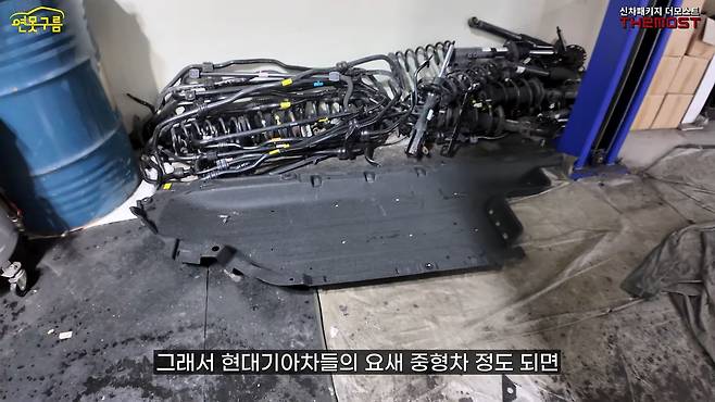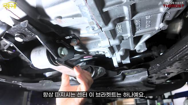 차량 중앙 하단을 보면, 흔히 따지는 센터 롤 브라켓이 하나 적용되어 미션을 지지하고 있습니다. 만약 전방에서 큰 충격이 발생하여 이 부분을 강하게 때리게 되면, 이 브라켓이 부러지면서 미션이 아래로 내려앉게 됩니다. 이것은 단순한 파손이 아니라, 충격 시 운전자의 무릎을 보호할 수 있는 매우 중요한 안전 설계입니다. 미션이 조금만 아래로 떨어져도 실내로 밀고 들어오는 양이 달라지기 때문에, 이러한 구조는 요즘 차량들에 공통적으로 적용되고 있습니다.