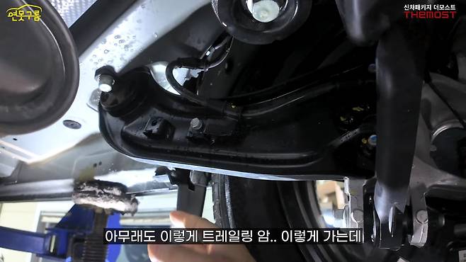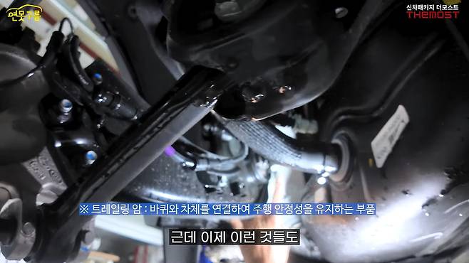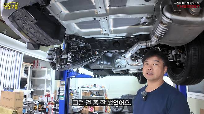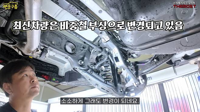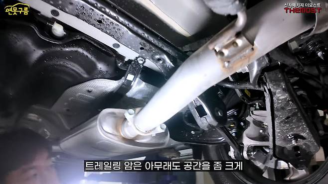 뒤쪽 하부 소재 또한 아주 고급스럽지는 않습니다. 너클은 알루미늄이 적용되었지만, 로어암, 상부암, 앞쪽 어시스트 암, 트레일링 암 등 대부분의 부품은 일반 철 재질로 되어 있습니다. 경쟁사 차종들을 보면 트레일링 암을 4개씩 잡고 안쪽에 브라켓을 덧대는 등 더욱 보강된 구조를 사용하는 경우가 많습니다. 앞으로 모델이 개선될 때는 이러한 점들을 적용해주면 좋겠습니다.
