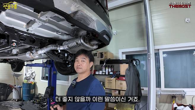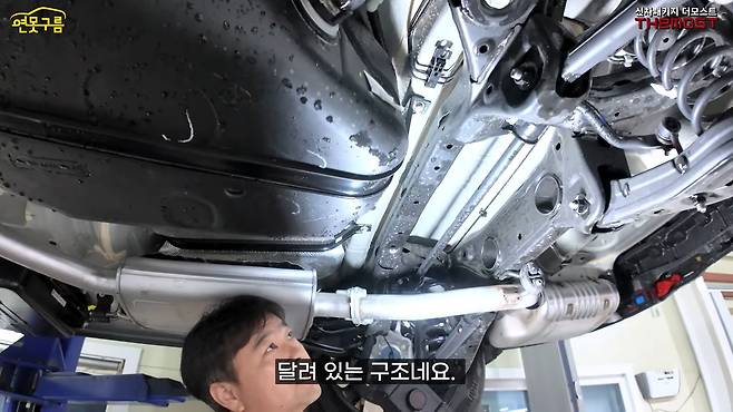 배터리는 차량 중간에 장착되어 있습니다. 현재 타고 있는 차량은 2륜 구동 전륜 모델이라 하부 중간이 상대적으로 휑하게 보일 수 있습니다. 4륜 구동 AWD 모델의 경우 이 자리에 드라이브 샤프트 프로펠라 샤프트가 지나가기 때문에 공간이 채워져 있습니다. 마찬가지로 후륜 또한 전륜 구동 차량이기 때문에 디퍼렌셜이 없어 다소 휑한 느낌을 줍니다. 중통 미들 파이프 위쪽에는 방열판을 이중으로 설치하여 연료 탱크를 보호하고 있는 모습입니다.