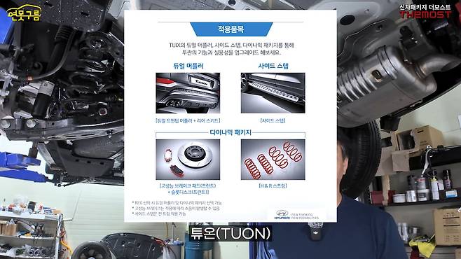 오늘 쏘렌토의 하체를 상세히 살펴보면서 좋은 점도 많았지만, 앞으로 개선될 부분도 분명히 있었습니다. 마지막으로 제가 한 가지 말씀드리고 싶은 것은, 예전에 현대차에는 '튜익스', 기아차에는 '튜온'이라는 공식 커스터마이징 상품이 있었습니다. 튜온은 기아자동차의 공식 커스터마이징 상품으로, 스테빌라이저나 스프링 같은 서스펜션 제품, 브레이크 등 다양한 부품들이 있었습니다.