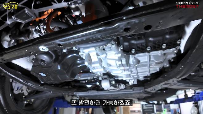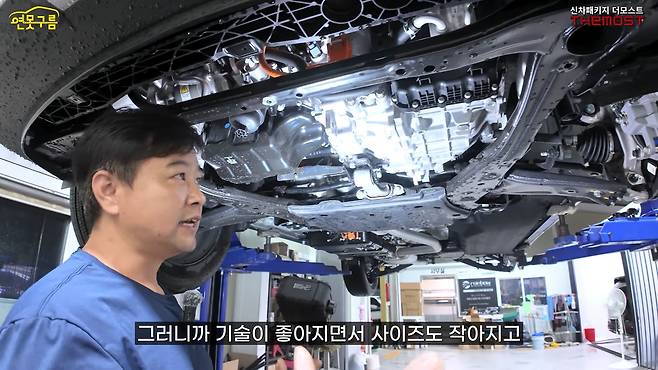 제가 예전에 현장에서 일할 때는 병렬식 하이브리드 시스템에서 엔진과 변속기 사이에 들어가는 모터의 두께가 상당히 두꺼웠습니다. 하지만 지금은 주황색 고압선이 보이지 않는다면 이것이 하이브리드 차량인지 의심할 정도로 모터 부분이 매우 슬림하게 축소되었습니다. 모터가 거의 눈에 띄지 않을 정도로 작아진 것이죠. 이러한 기술 발전 덕분에 지난번 팰리세이드 차세대 2.5 하이브리드에 대한 이야기를 나눌 때, 이 정도 구조라면 카니발에는 들어가기 힘들겠다는 추론을 했던 기억도 있습니다.