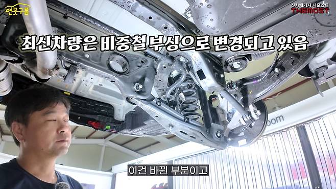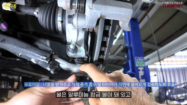 전용 부품은 훨씬 비싸기 때문에, 모듈 공유는 결코 나쁜 것만은 아닙니다. 하부 서스펜션 구조를 자세히 살펴보겠습니다. 우물 정 자 형태의 프레임이 적용되어 있으며, 로어암은 일반적인 주철 소재를 사용하고 있습니다. 볼 조인트는 알루미늄 합금 볼이 적용되어 경량화에 신경 쓴 모습입니다. 너클 또한 합금 소재가 사용되었습니다. 너클과 쇼바가 결합되는 구조는 일반적인 대중차에서 볼 수 있는 볼트가 관통되는 형태로 되어 있습니다.