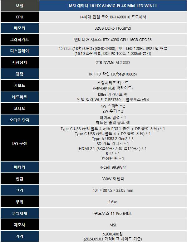 MSI 레이더 18 HX A14VIG-i9-i9 4K Mini LED WIN11(이하 MSI 레이더 18 HX A14VIG-i9-i9)는 404 * 307.5 * 32.05mm 크기에 3.545kg 무게에 MSI 특유의 디자인 요소가 가미된 게 인상적인 하이엔드 노트북이다.